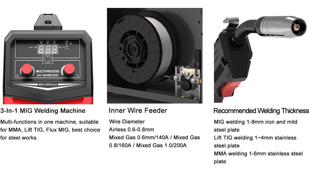 Dual Voltage, Lift Tig Function: This MIG-200 is 110V/220V dual voltage MIG welder, with a Lift TIG function, ARC(MMA) / MIG 3 in 1. Gas/gasless modes all are available. Note: TIG Torch is not included. It can be used for welding various metals. Meet different welding requirements. When using MIG, just adjust the current and the voltage will change automatically.