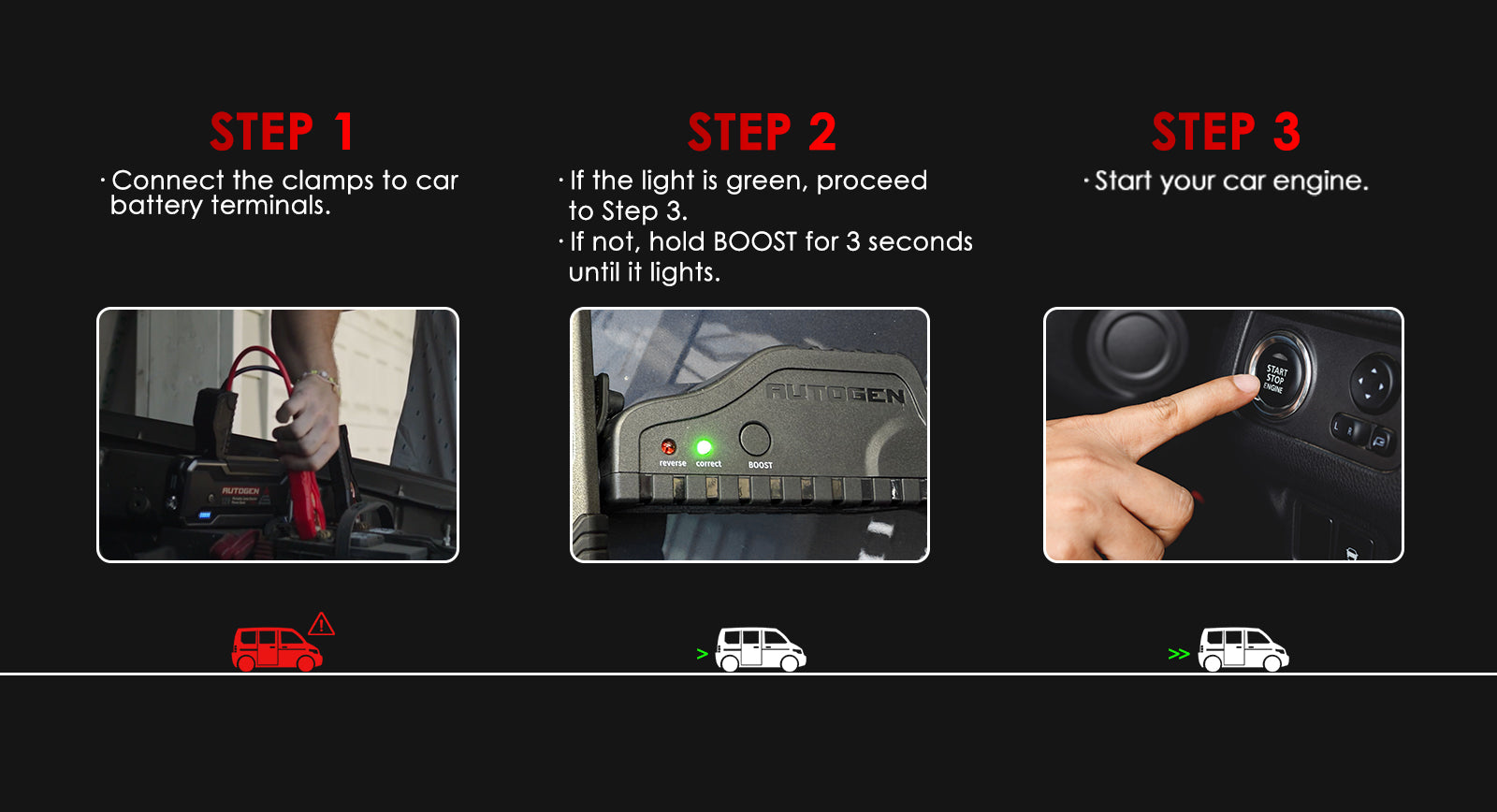 - Ensure the jump starter is charged with at least 60% power (3 bars or more).